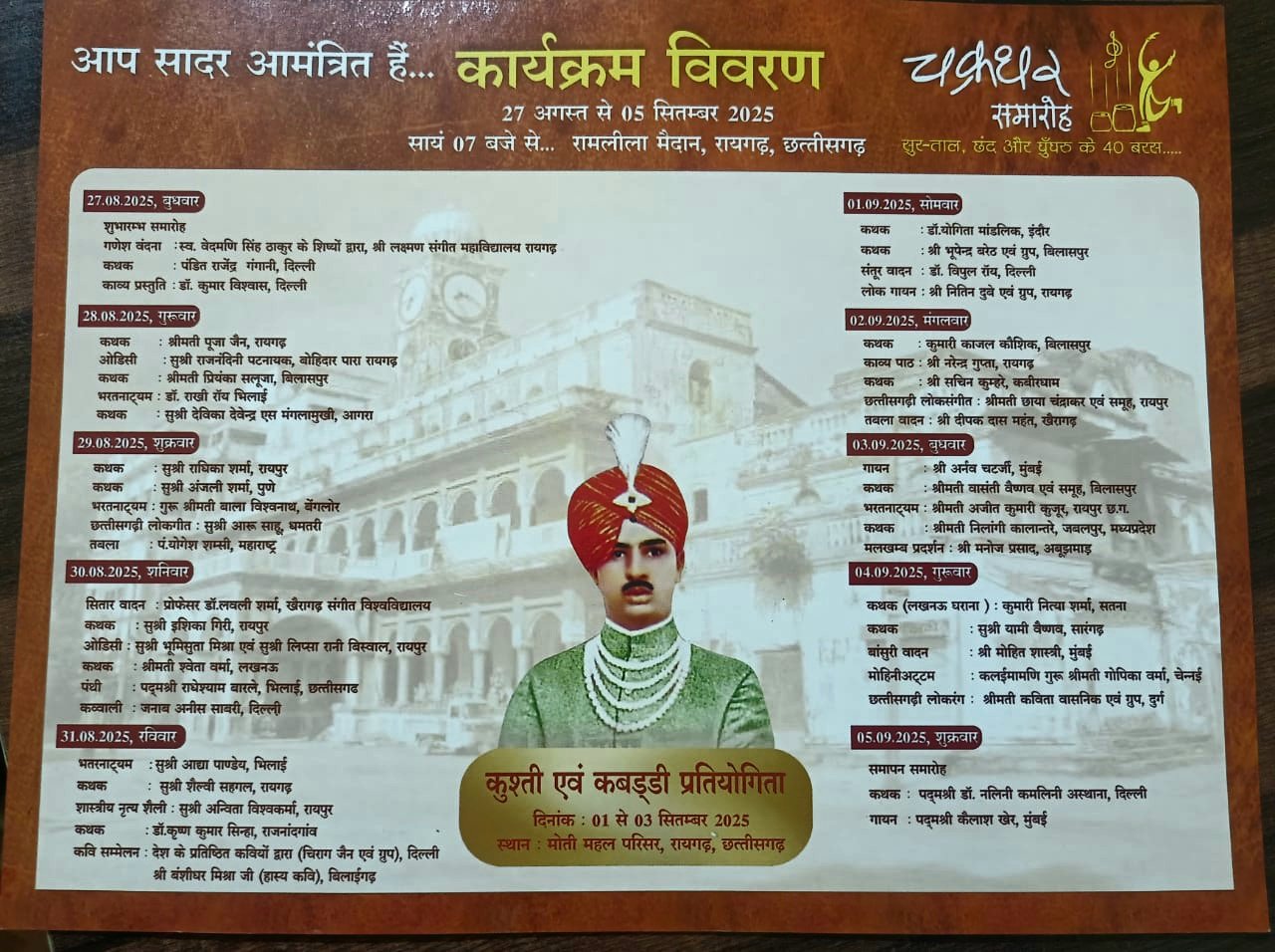 рд░рд╛рдпрдЧреЭ – рд╕реНрдерд╛рдиреАрдп рд░рд╛рдорд▓реАрд▓рд╛ рдореИрджрд╛рди рдореЗрдВ 27 рдЕрдЧрд╕реНрдд рд╕реЗ 05 рд╕рд┐рддрдореНрдмрд░ 2025 рддрдХ рднрд╡реНрдп рдЪрдХреНрд░рдзрд░ рд╕рдорд╛рд░реЛрд╣ рдХрд╛ рдЖрдпреЛрдЬрди рдХрд┐рдпрд╛ рдЬрд╛ рд░рд╣рд╛ рд╣реИред рдЗрд╕ рдЕрд╡рд╕рд░ рдкрд░ рд╕рд╛рдВрд╕реНрдХреГрддрд┐рдХ, рд╕рд╛рдорд╛рдЬрд┐рдХ рдФрд░ рдЦреЗрд▓рдХреВрдж рдХрд╛рд░реНрдпрдХреНрд░рдореЛрдВ рдХреА рдЖрдХрд░реНрд╖рдХ рд╢реНрд░реГрдВрдЦрд▓рд╛ рдкреНрд░рд╕реНрддреБрдд рд╣реЛрдЧреАред рдЖрдпреЛрдЬрди рд╕рдорд┐рддрд┐ рдиреЗ рдмрддрд╛рдпрд╛ рдХрд┐ рдЗрд╕ рдмрд╛рд░ рдХрд╛рд░реНрдпрдХреНрд░рдо рдХрд╛ рдореБрдЦреНрдп рдЖрдХрд░реНрд╖рдг рдЫрддреНрддреАрд╕рдЧрдврд╝реА рд▓реЛрдХрдиреГрддреНрдп, рд▓реЛрдХрдЧреАрдд, рдирд╛рдЯрдХ, рдХрдмрдбреНрдбреА рдПрд╡рдВ рдХреБрд╢реНрддреА рдкреНрд░рддрд┐рдпреЛрдЧрд┐рддрд╛ рд░рд╣реЗрдЧреАред