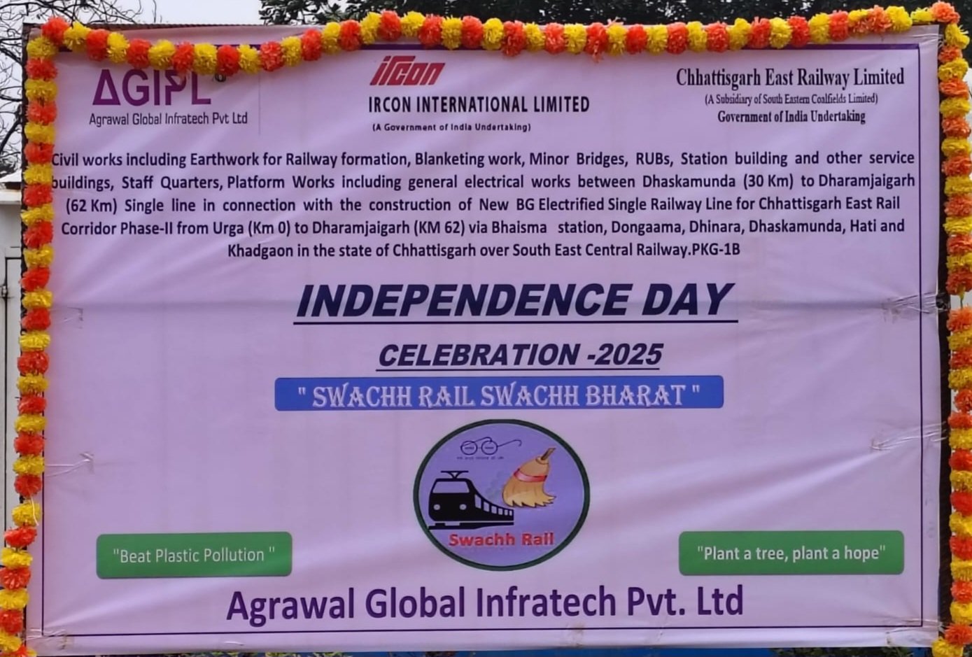 धरमजयगढ़ – राष्ट्र के 79 वें स्वतंत्रता दिवस 2025 का उत्सव धरमजयगढ़ रेल परियोजना स्थल पर धूमधाम से मनाया गया। इस अवसर पर छत्तीसगढ़ ईस्ट रेलवे लिमिटेड और इरकॉन इंटरनेशनल लिमिटेड के सहयोग से अग्रवाल ग्लोबल इन्फ्राटेक प्राइवेट लिमिटेड ने विशेष कार्यक्रम आयोजित किया।